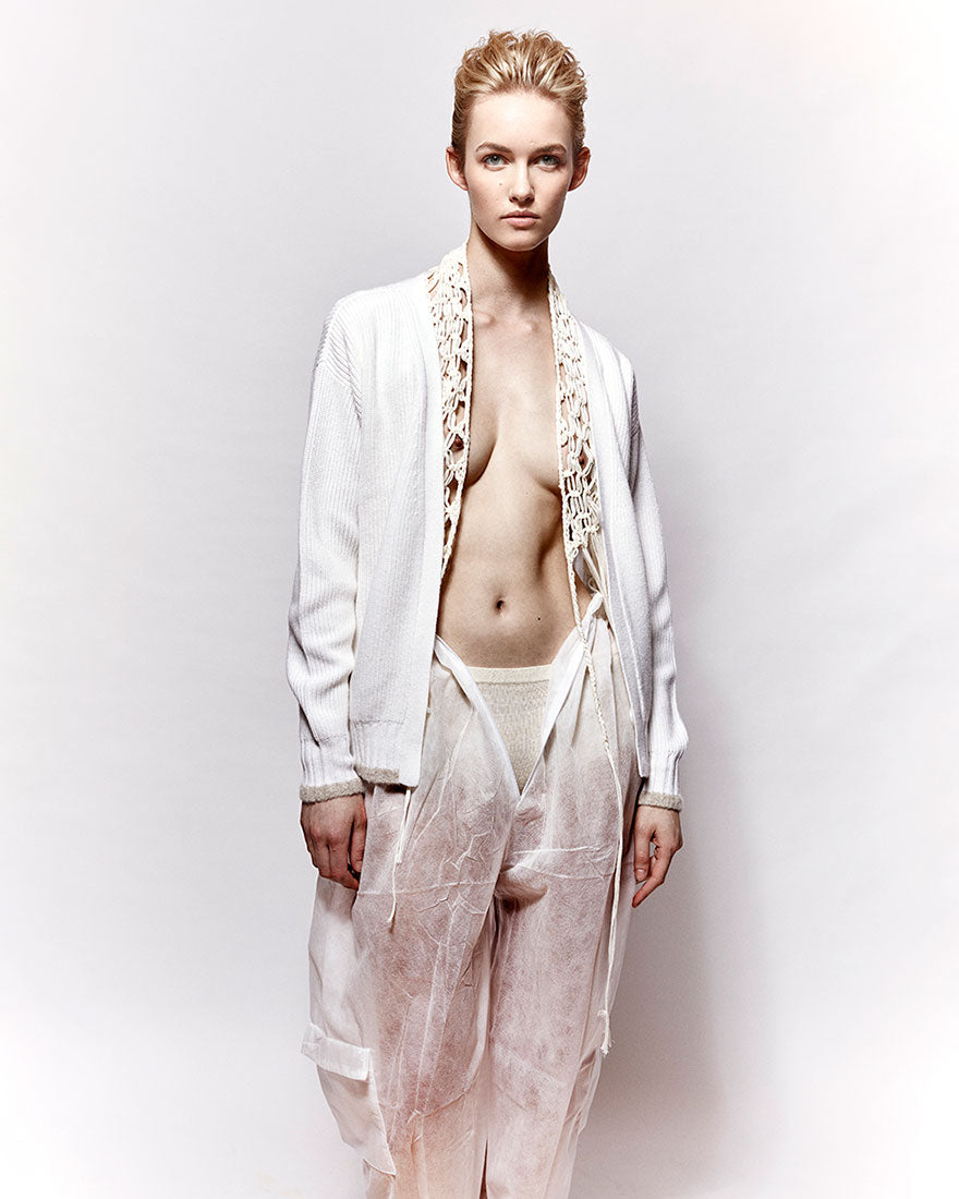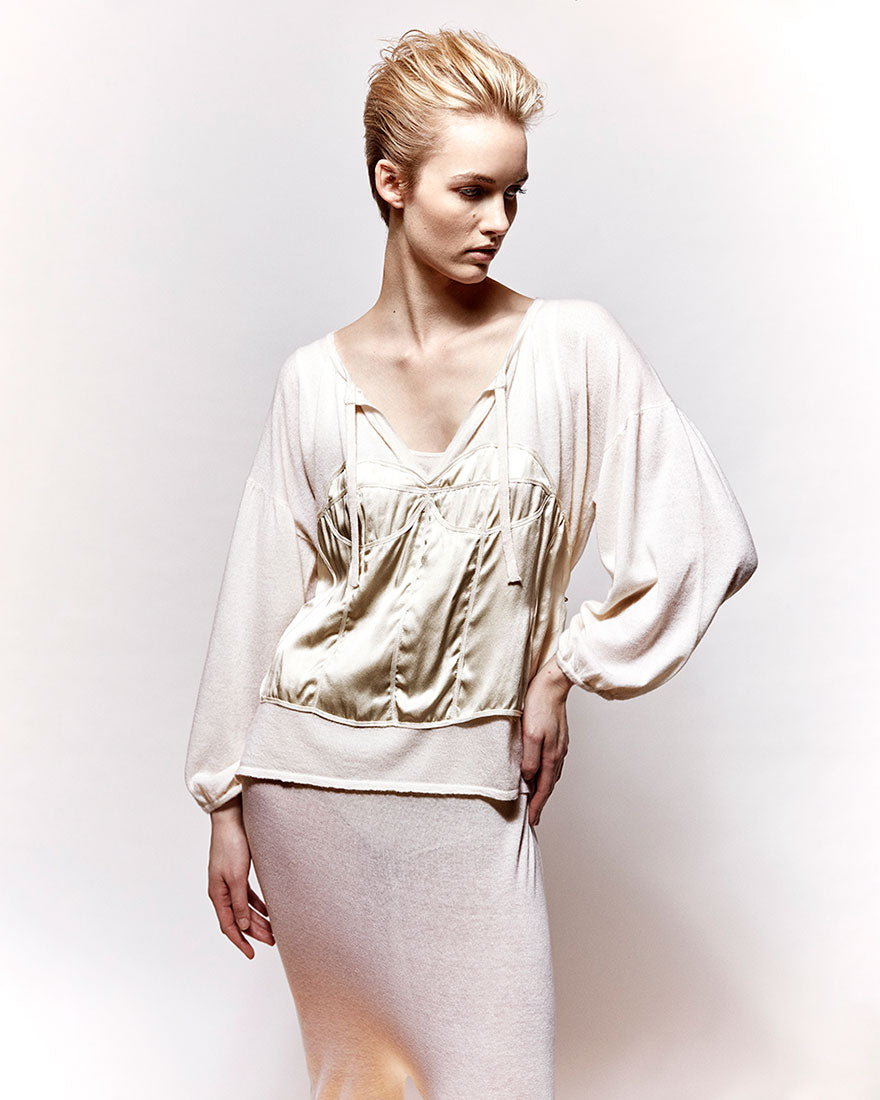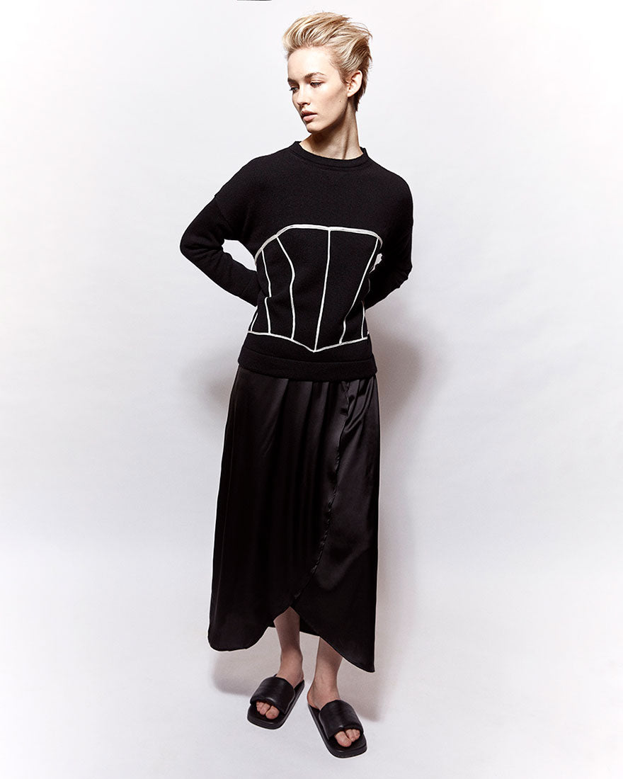 A need of softness, sensitivity and tactile delicacy is accentuated by the body’s lines. Each piece showcases meticulous craftsmanship, with delicate bustier - inspired datails adorning the knitwear, accentuating curves and highlighting the beauty of the body.