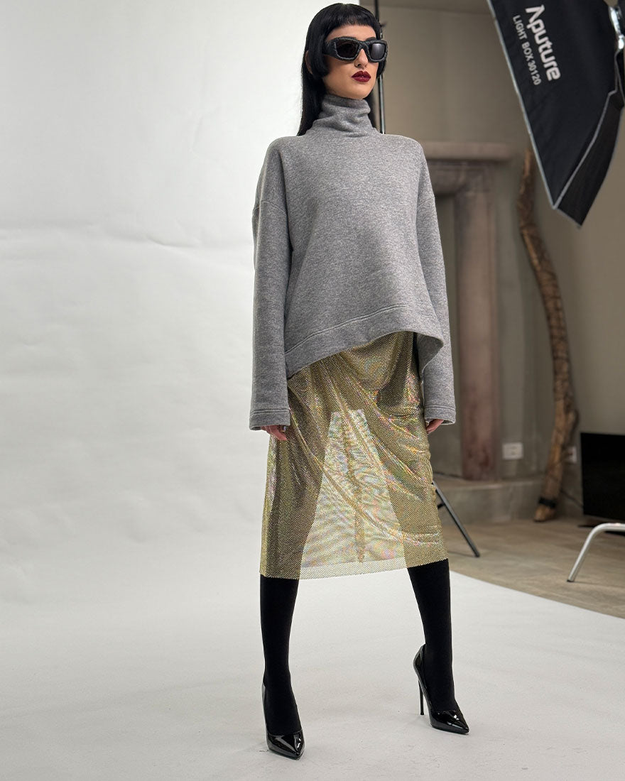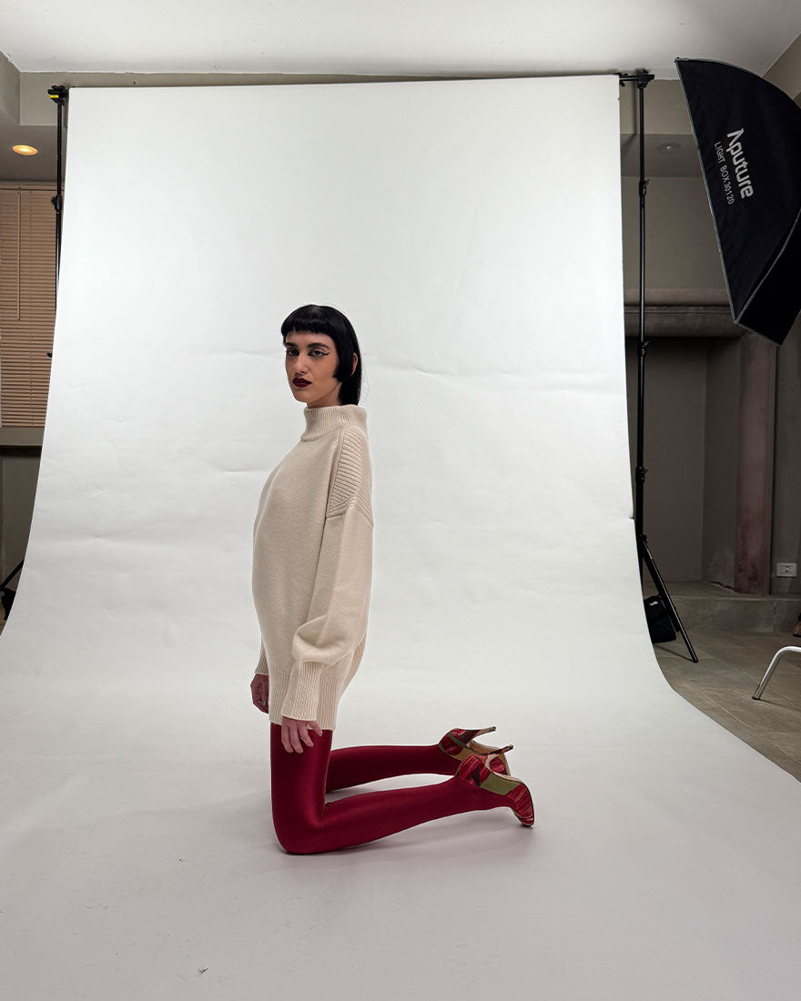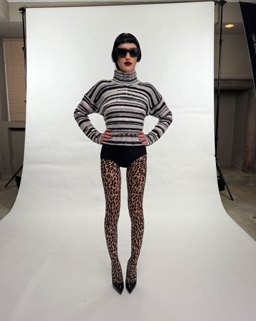 Textures take center stage: precious yarns, such as cashmere and cashmere silk, crafted with sophisticated techniques, evoke Freud's textured and layered brushstrokes. The collection incorporates artisanal details and craftsmanship, constructing surfaces that seem to tell the story of a life lived—a direct homage to the depth of the artist's pictorial material.