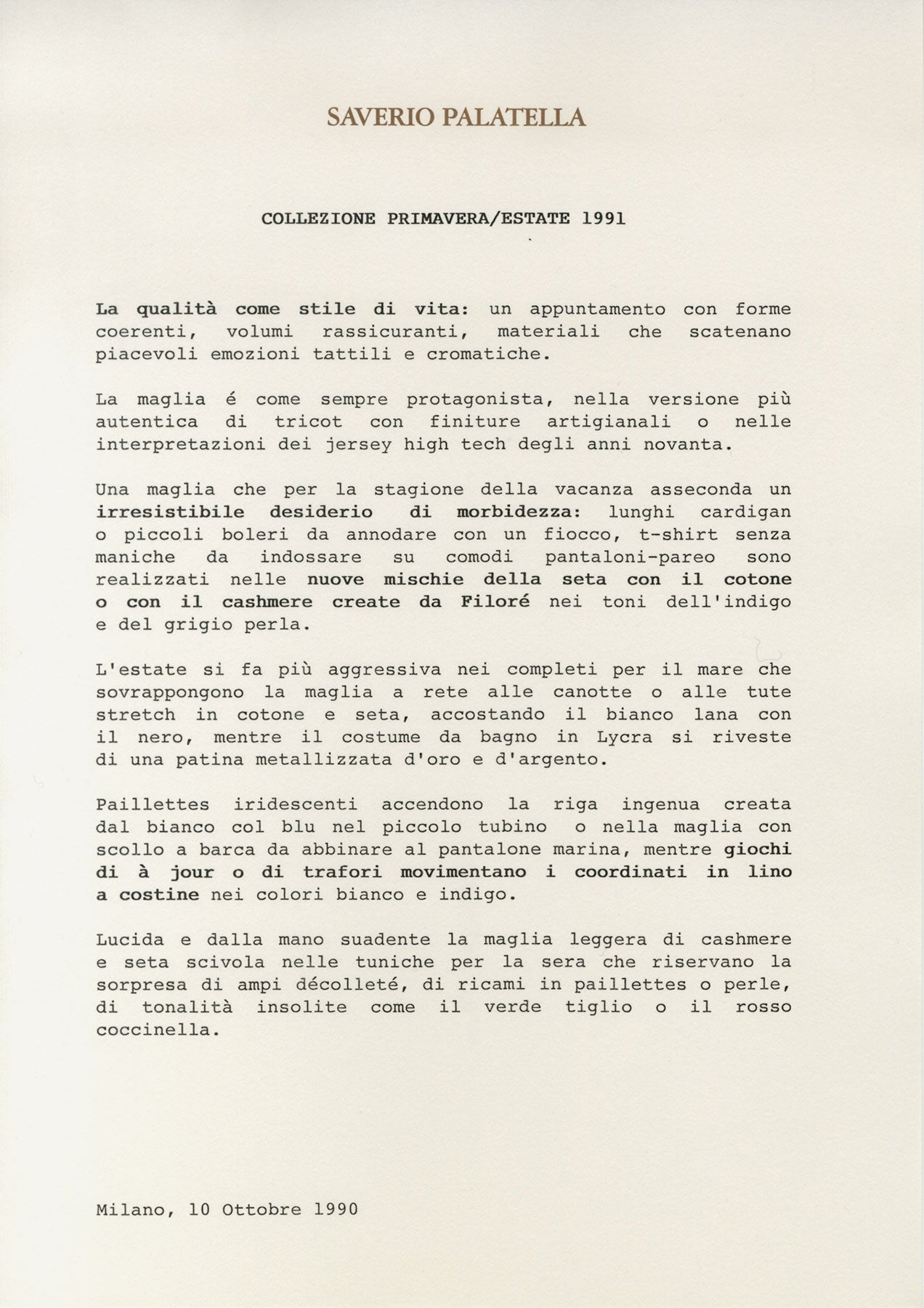 Srping Summer 1991 Collection Press Release