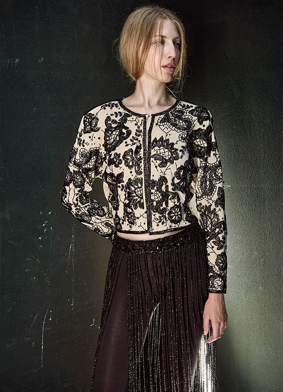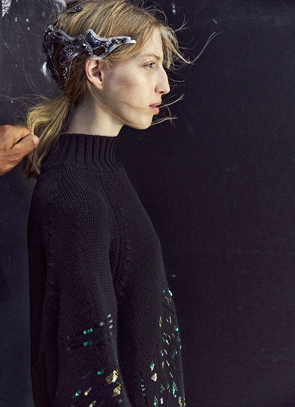 Make a Wish transforms knitwear into a canvas of light and texture. Soft cashmere silhouettes are elevated by sequin embroidery. Patchwork compositions, crafted with archival stitch techniques, blend different knit textures, creating a rich, layered effect that celebrates the artistry of craftsmanship.